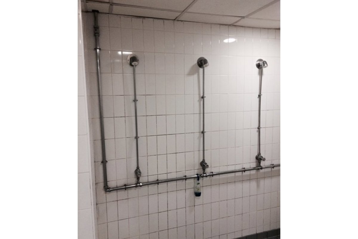 The pictures above show before and after a recent upgrade on a communal showering facility. This makeover was completed over a single weekend. The first task was to deep clean with a power washer, followed by removal of the old stainless steel pipework. Rather than removing the tiles, the walls were then battened, boarded and sealed with pale wet-wall and new pipes dropped down to each shower head position. The Duŝo shower column, a fully pre-plumbed assembly, was then extremely quick to install and easy to connect to the pre-blended water supply.