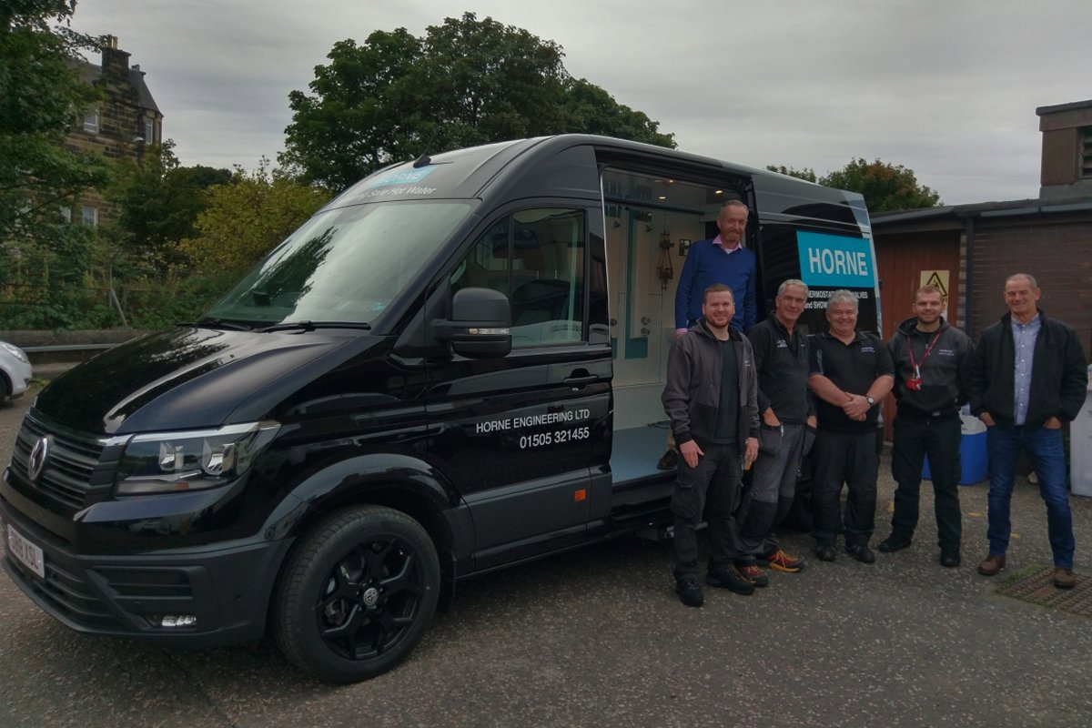 It's been a long time coming! Firstly, the vehicle specification had to be just right and thus the vehicle itself was made to order. 4 months later, the bespoke fit-out began and that could not be rushed! Glasgow-based specialist camper-van conversions firm, Caledonian Campers, have paid the very closest attention to every single detail – the insulation, to the flooring, to the wall and ceiling paneling, to the central heating and power supply for the very special lighting, computer, coolbox and coffee machine! Of course, they are now also suitably experienced to install Horne showers, taps and TMVs! Then there was the graphic wrap, boldly featuring our 3 latest innovations: the patented ILTDU, the quirky and modern Duŝo shower column and the award-winning Optitherm thermostatic tap. A beautiful job was done here by Hillington-based Autograph Signs, using images commissioned from our friendly 3D Artist, Adam Brewster.