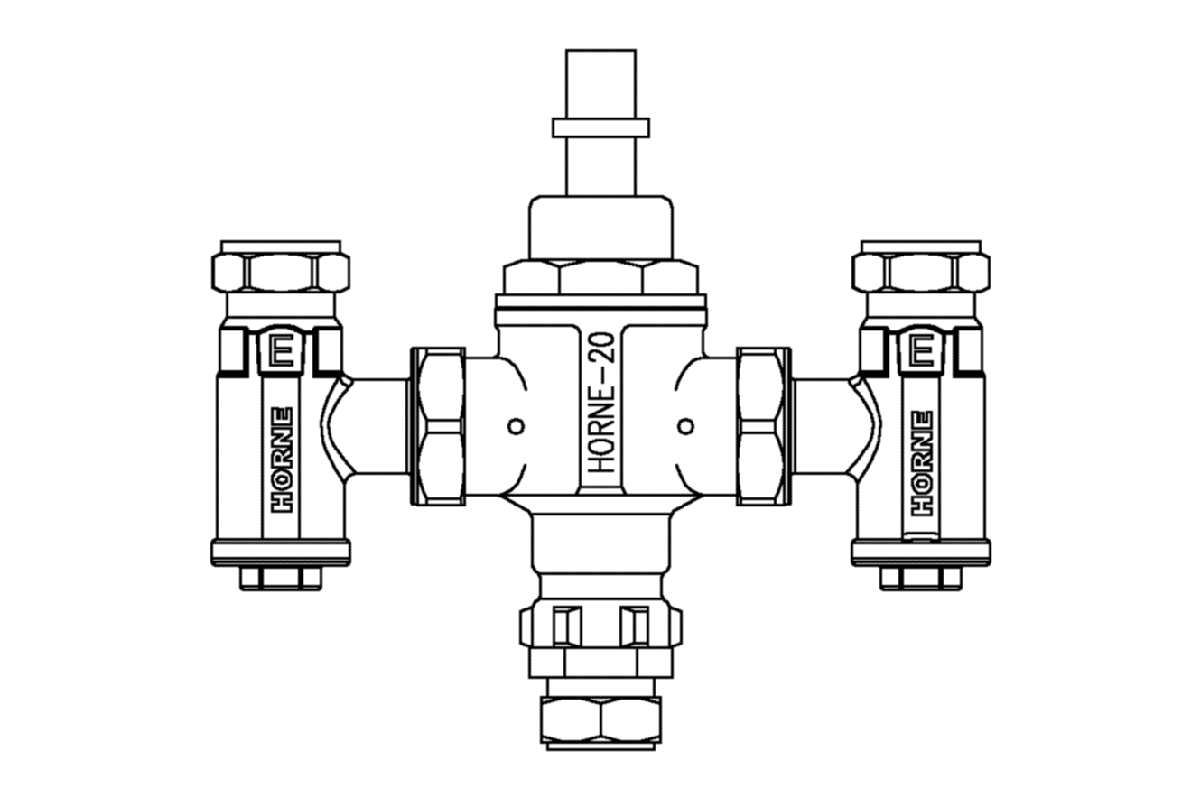 Including swivel inlet connections, strainers, check valves and flow regulator. Pipe connections by compression fitting for 22mm copper pipe. In bronze finish. Product Reference H20-11B and drawing PA-579Q. To be installed according to the manufacturer's instructions and commissioned in accordance with water regulations and bylaws using the Horne H20 Flushing kit.