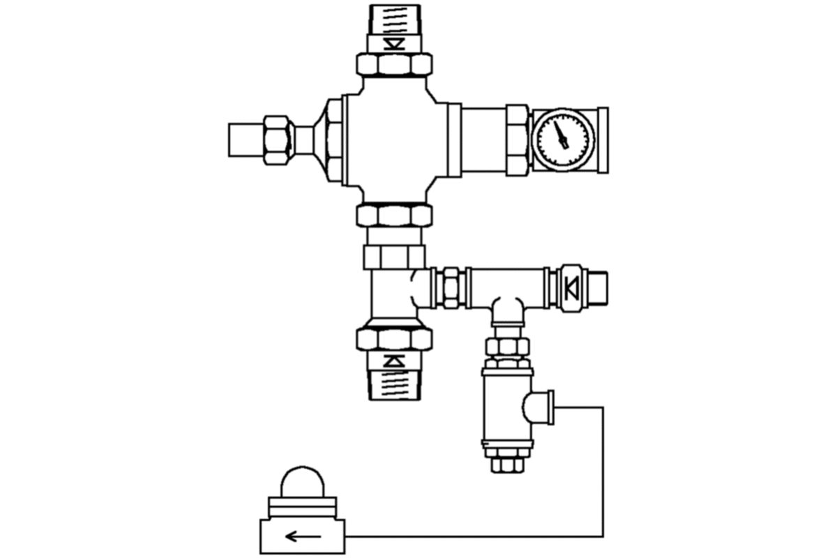 A pre-assembled unit for circulating Domestic Hot Water Systems including the Horne 32 Thermostatic Mixing Valve with check valves - inlet connections male screwed 1 1/4 inch B.S.P. (DN32) and outlet connection female tapped 1 1/4 inch B.S.P. (DN32) - dial thermometer, return limiter and ball flow indicator. Ranges of temperature adjustment available: