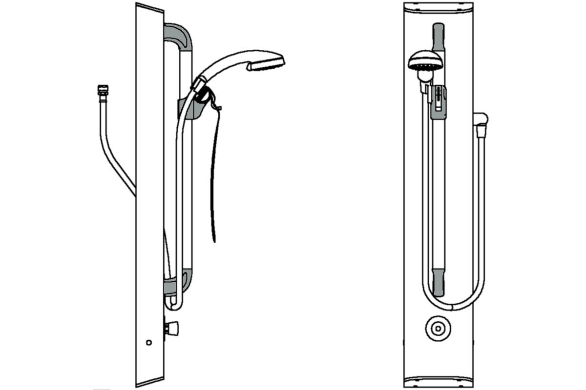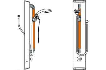 A white epoxy-polyester powder-coated and pre-plumbed (in copper) aluminium panel with push button timed flow control and shower kit, comprising chromium-plated THREE FUNCTION shower hand set, flexible hose and riser rail. Connections by SOFT-PEX flexible braided hose for concealed water supply. Product Reference S407B as per drawing No. D10360.