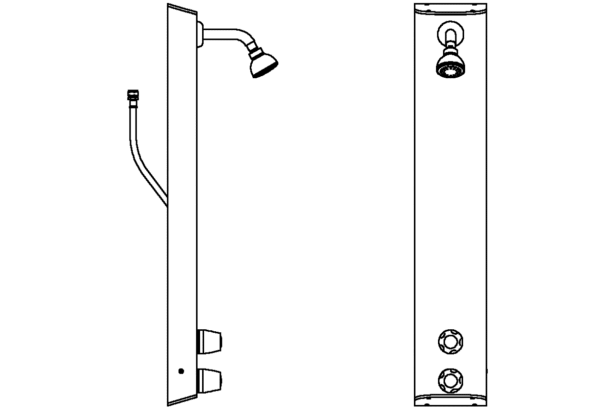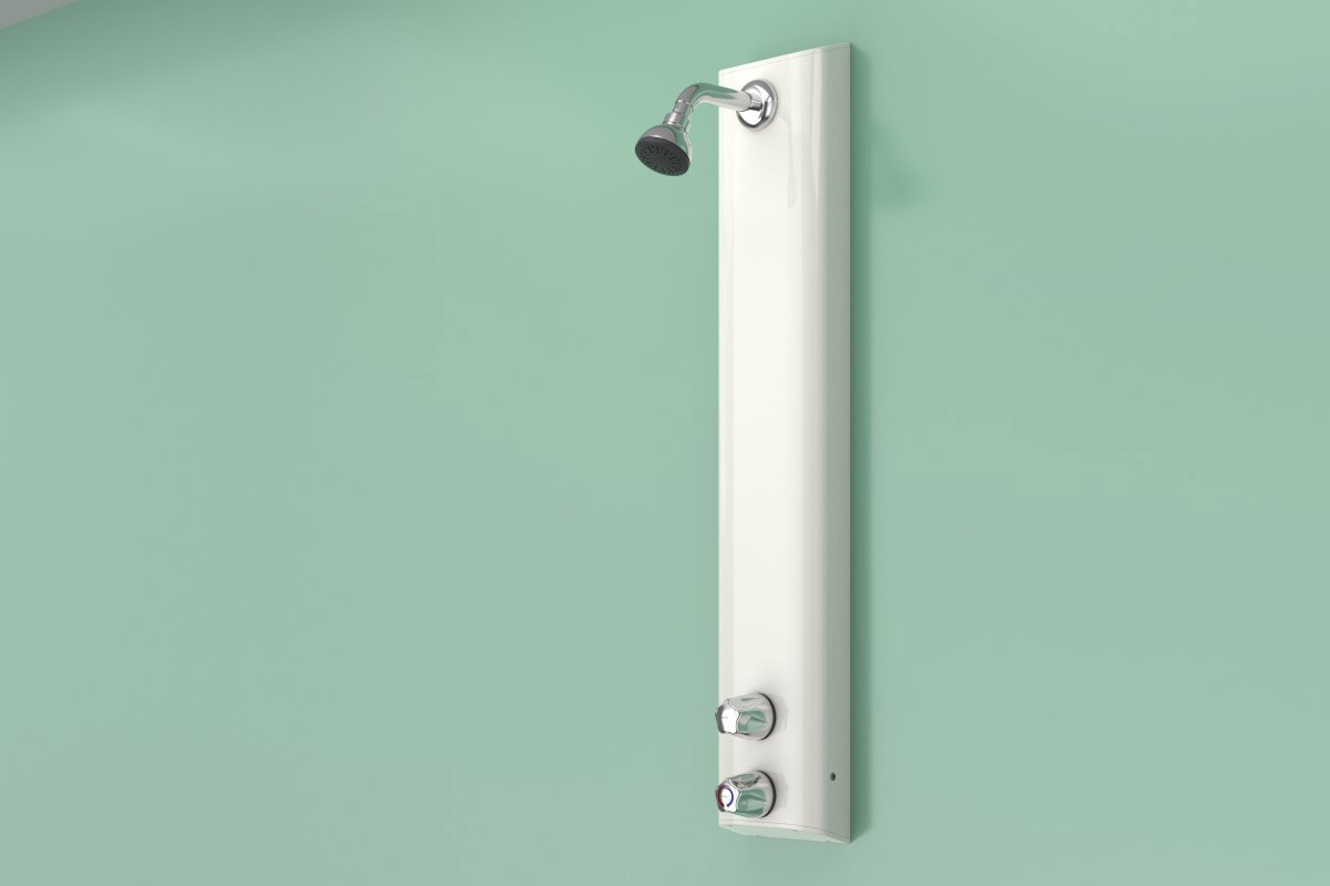 Includes integral TSV1-3 thermostatic shower valve pre-plumbed within a white epoxy-polyester powder-coated aluminium panel with hand controls and easy clean swivel shower head with flow regulator in chromium plated finish. Connections by SOFT-PEX flexible braided hose for concealed water supply. Product Reference T106B as per drawing D10343. To be installed according to the manufacturer's instructions and commissioned in accordance with water regulations and bylaws using the Horne TSV1 Flushing kit.