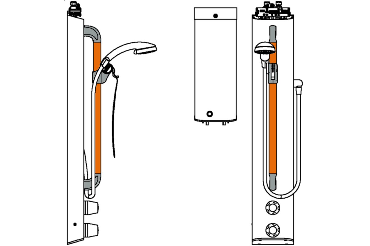 Includes integral TSV1-3 Thermostatic Shower Valve and In-Line Thermal Disinfection Unit, ILTDU, pre-plumbed (in copper) within a white epoxy-polyester powder-coated aluminium panel with hand controls and shower kit, comprising flow-regulated chromium plated three function easy-clean shower hand set with flexible hose and riser rail in Deep Orange, and 465mm pipe cover with ILTDU key slot. Product Reference T1Y7T4 as per drawing No. D11346. To be installed according to the manufacturer's instructions and commissioned in accordance with water regulations and bylaws using the Horne TSV1 Flushing kit.