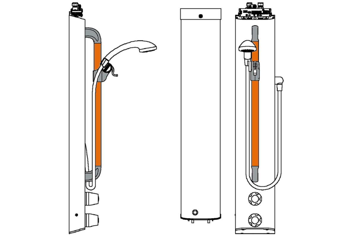 Includes integral TSV1-3 Thermostatic Shower Valve and In-Line Thermal Disinfection Unit ILTDU pre-plumbed (in copper) within a white epoxy-polyester powder-coated aluminium panel with hand controls and shower kit, comprising flow-regulated chromium plated single function easy-clean shower hand set with flexible hose, riser rail in Deep Orange, and 940mm pipe cover with ILTDU key slot. Product Reference T1Y8T9 as per drawing No. D11351. To be installed according to the manufacturer's instructions and commissioned in accordance with water regulations and bylaws using the Horne TSV1 Flushing kit.