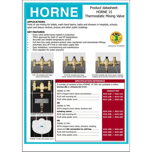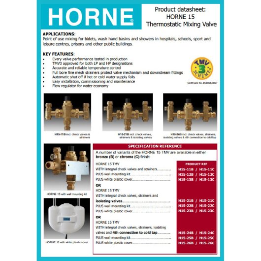 Horne 15 Datasheet (E) (372KB, pdf) Product Datasheet for Horne 15 (Type H1503) Thermostatic mixing valve (TMV) with 'E' generation inlet assemblies More