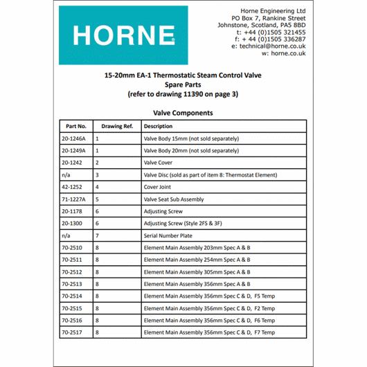 15mm & 20mm EA-1 Spare Parts (419KB, pdf) List of Part numbers and descriptions with labelled drawing for Horne EA-1 thermostatic steam control valve. DN15 and DN20 More