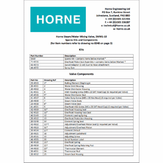 SWM1-10 Spare Parts (293KB, pdf) Complete spare parts list - kits, components and parts drawing D8348 for Horne SWM1 Steam and Water Mixing Valve, SWM1-10. More